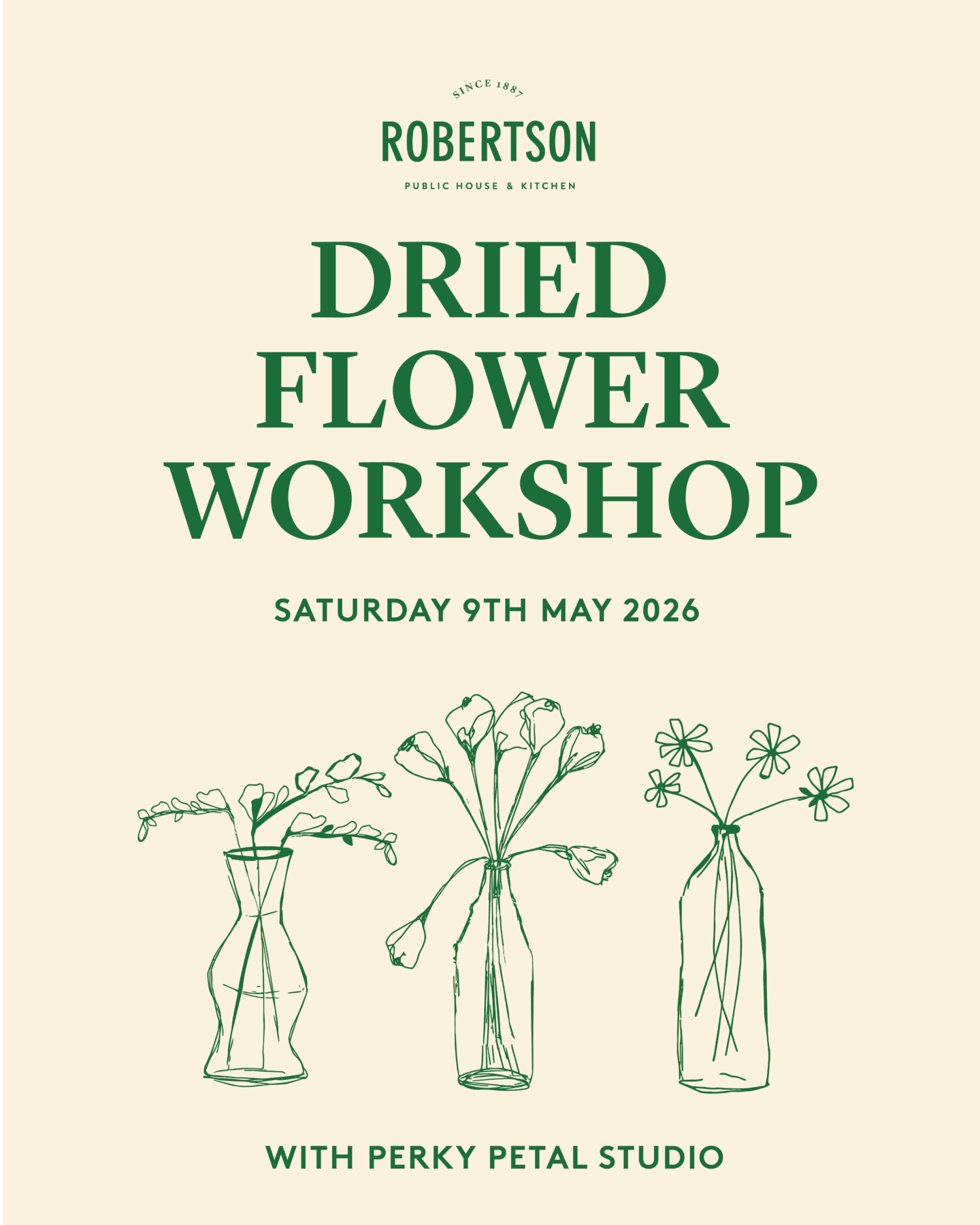 Join us at Robertson Public House on Saturday, 9th May for a beautiful and creative dried flower workshop hosted by Suze from Perky Petal Studio.