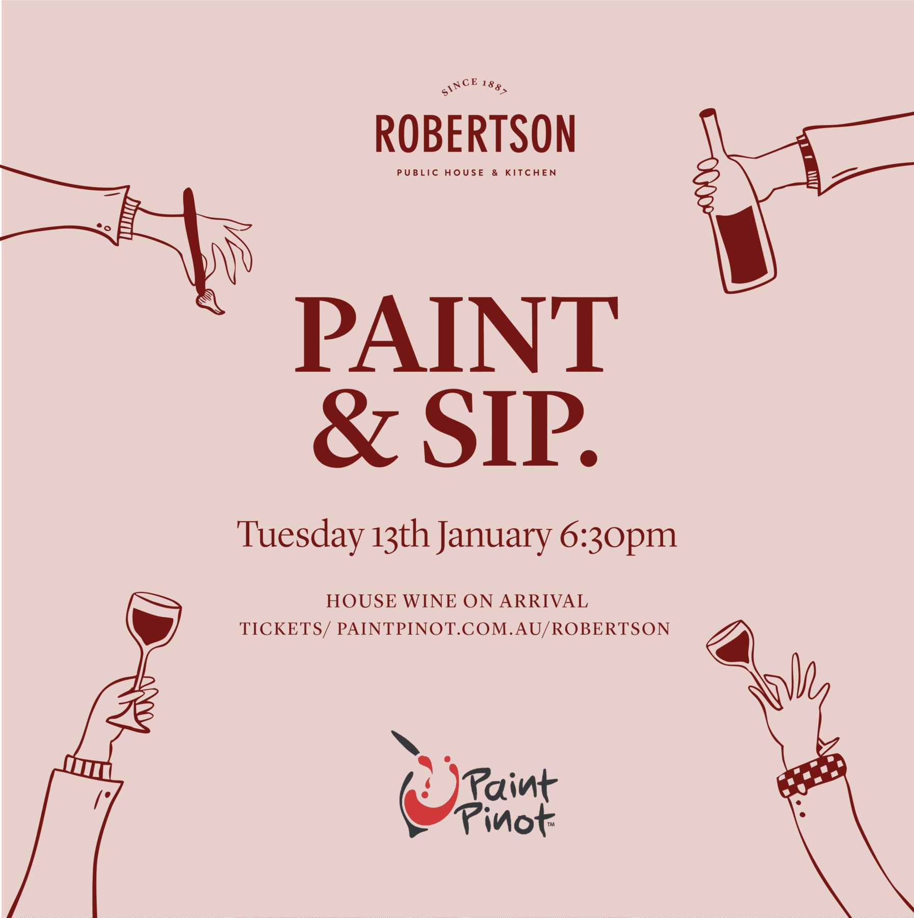 We’ve partnered with Paint & Pinot to bring you vibrant monthly paint & sip sessions right here in Robertson!